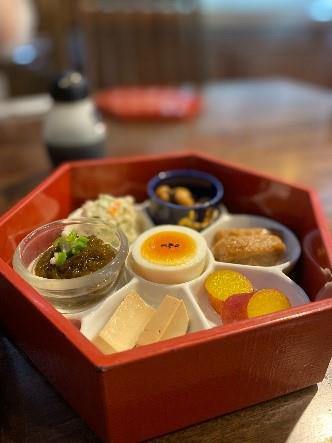 After drastic refurbishment, one of the old storehouses has been turned into a restaurant. Together with their meal, diners can order a tasting set of three different varieties of sake. Each of these is different—for example, one is fruity, and one is refreshing, helping to bring out the qualities of different foods—and diners will no doubt be surprised by the rich variation. Served on quintessentially Japanese plates, the food itself is magnificent, providing visitors with a luxurious opportunity to experience Japanese food culture using both taste and sight. A particular highlight is the freshly made tofu, which is packed with the aroma and sweetness of soy beans. It is served with every course on the menu, and pairs superbly with the sake.