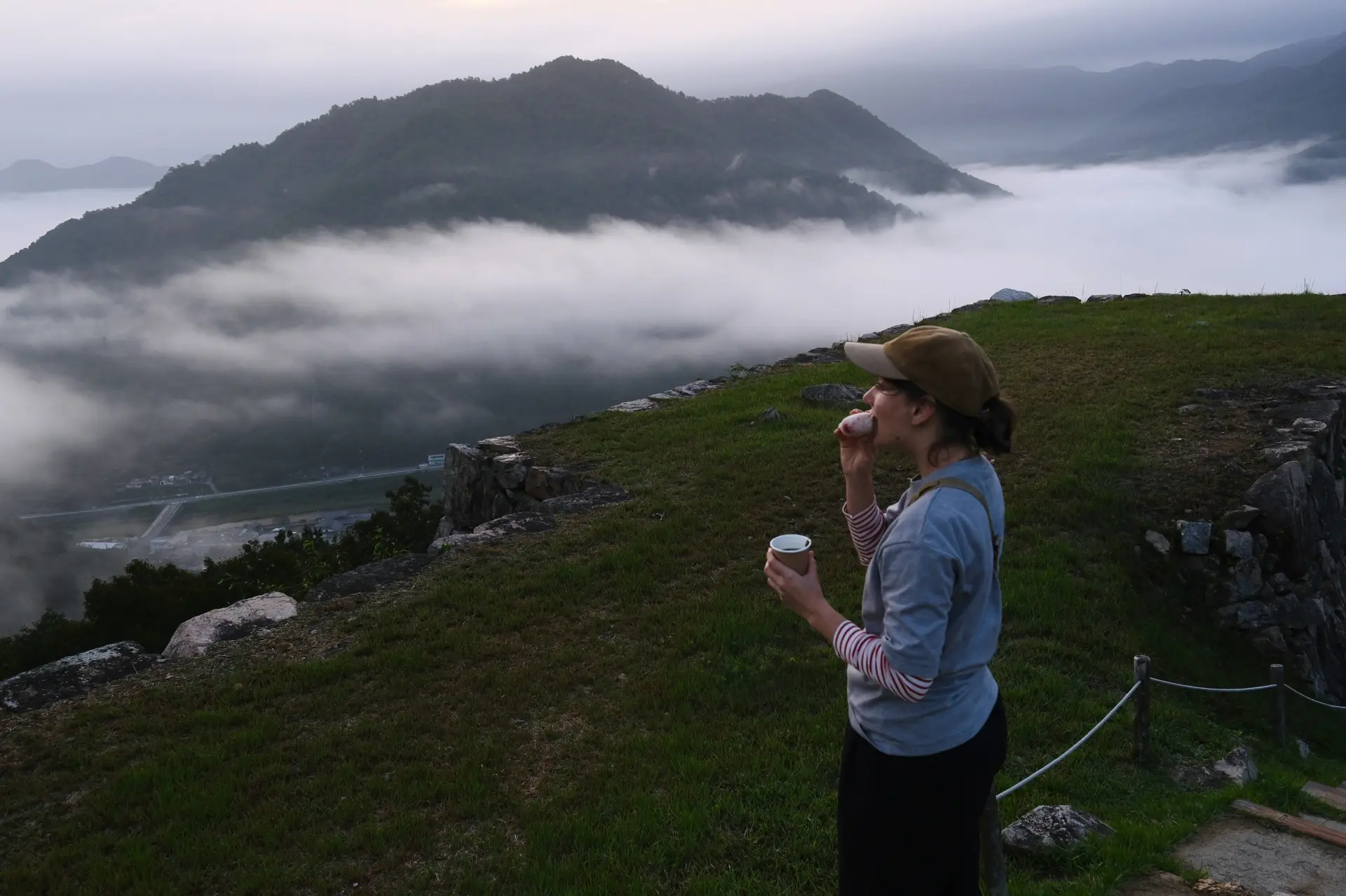 The morning in Takeda Town begins long before sunrise. Armed with a small breakfast set of onigiri and miso soup prepared by Takeda Castle Town Hotel EN, we began the steady climb toward the Takeda Castle Ruins.