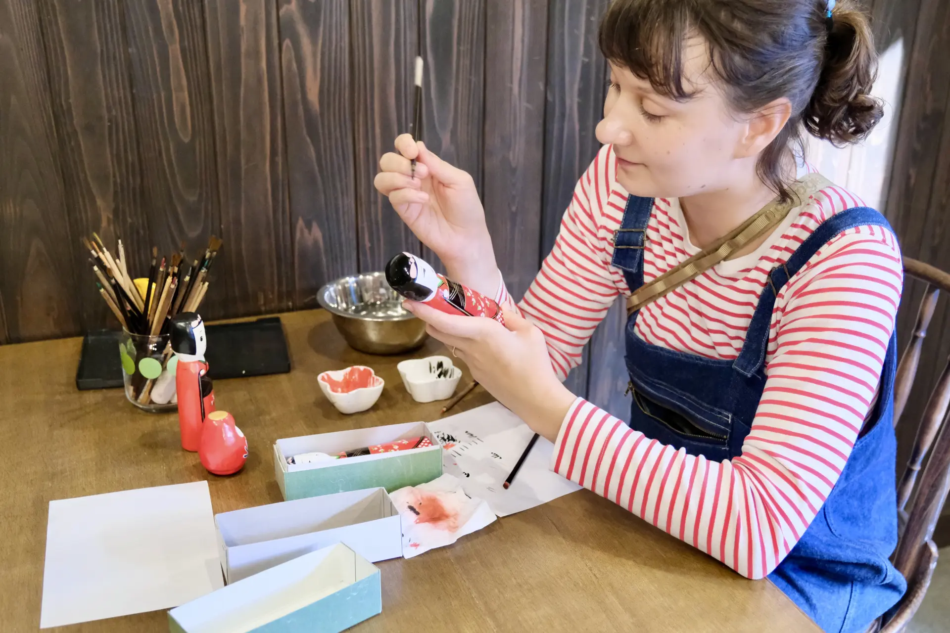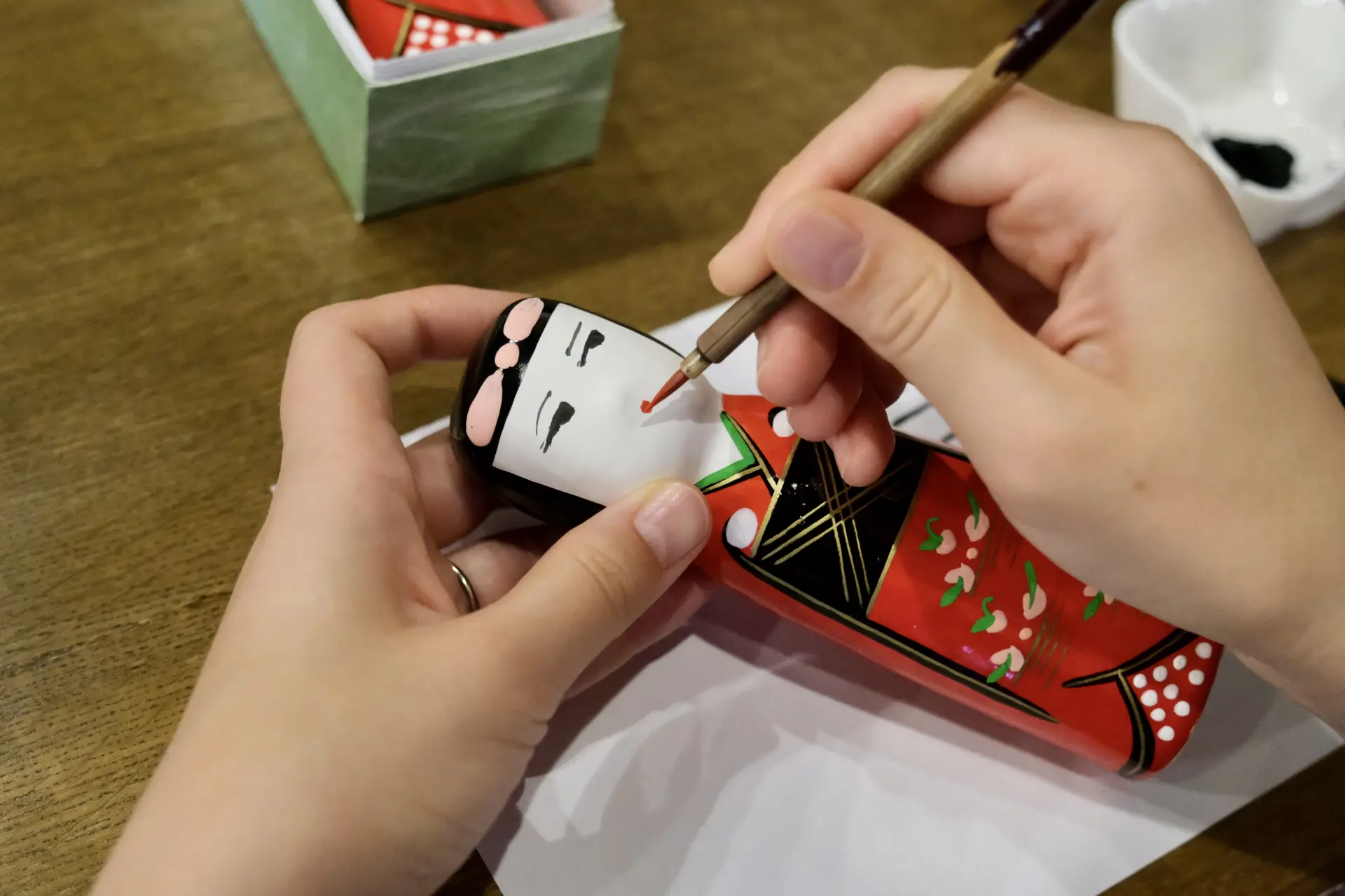 Inside the small workshop, a master craftsman invites visitors to sit and paint their own wooden dolls, using smooth local wood sourced from the surrounding Tottori mountains.