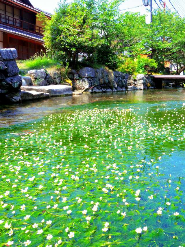 Here the baikamo, a rare white aquatic flower that blooms in water, can be see in the clear waters of the Jizo River.