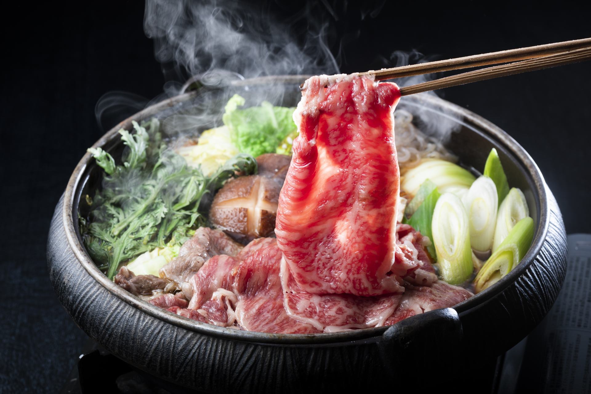 Picture of finished sukiyaki with Matsusaka beef