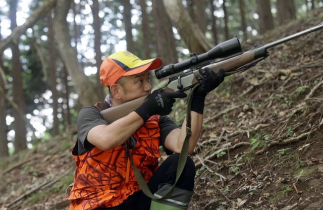 Gibier hunter Kentaro Nakajima with a hunting rifle