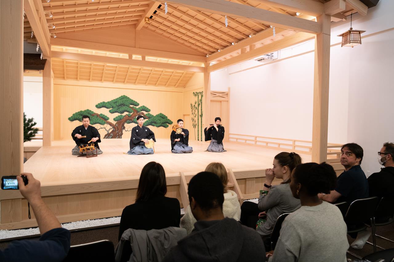 体験プログラムのクライマックスはなんといっても舞台鑑賞。鑑賞の前に能楽の装束の着付けを見学。装束や小道具の解説を聞きながら、男性の能楽師が女性の登場人物に変身していく様子が間近に見られます。普段は着付けが公開されることはありませんので、とても貴重な機会です。この日は見学でしたが、希望すれば参加者自身が着付け体験もできます。そして、紙芝居式のスライドで演目のあらすじを学んだ後、「羽衣」の演目を鑑賞。能楽師たちが至近距離の舞台に勢揃いして鑑賞する能は、圧巻です。