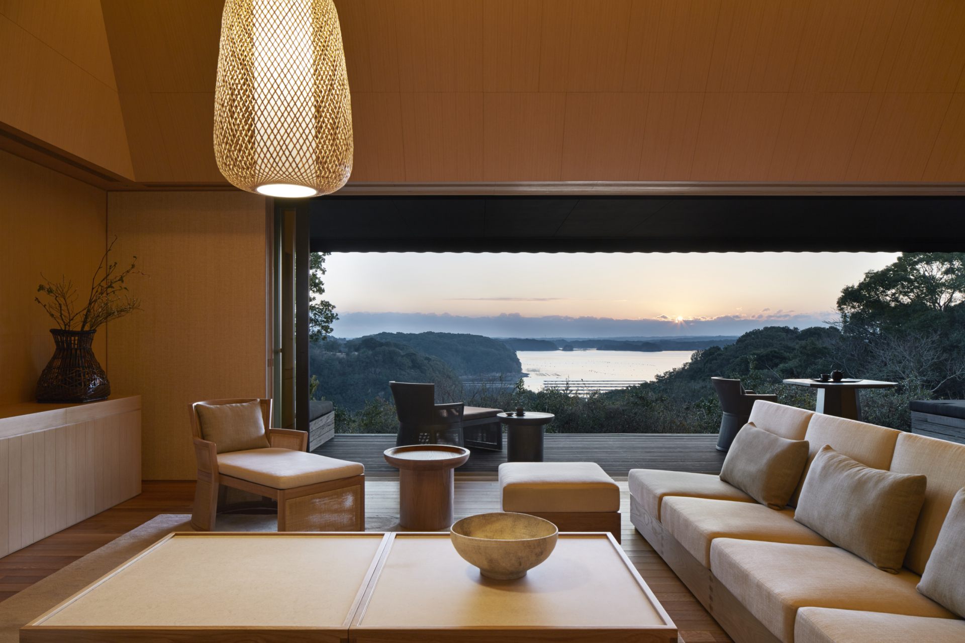 田中紀子総支配人の出迎えを受け、スイート仕様のゲストルームへ入ると、大きく取られた窓の向こうには英虞湾の絶景。しばらく無心で眺めていたくなる美しさです。古民家など日本の伝統的な美意識にインスパイアされた空間も、初めてなのに懐かしさを感じるような居心地の良さ。身も心も和んでいくのを実感します。