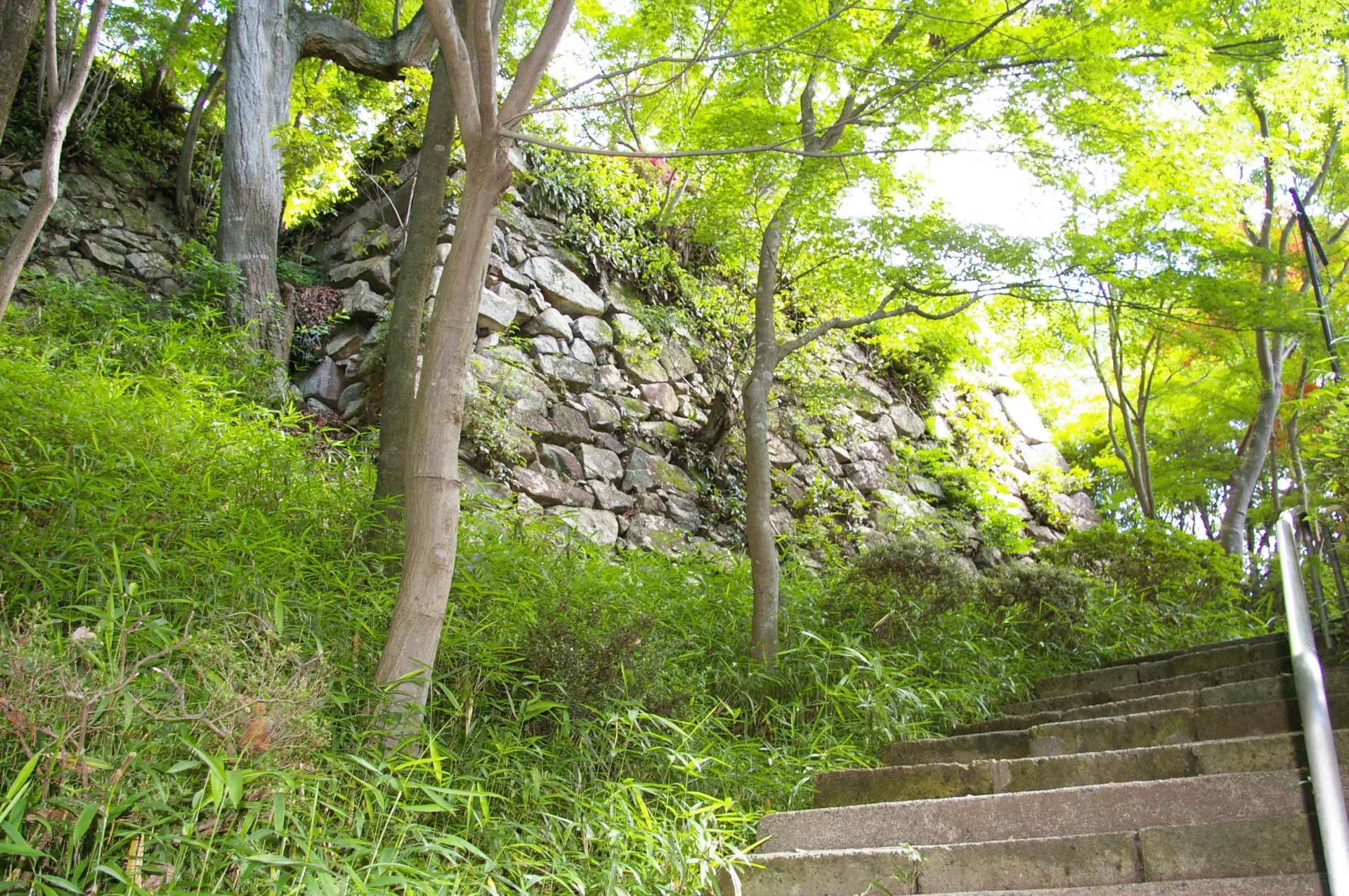洲本城には、山頂から山麓に向けて、階段状に延々と続く「登り石垣」があります。縦方向に石垣を積むことで敵の横移動を封鎖する目的で築かれたといわれており、全国でも数例しかない、珍しいものです。