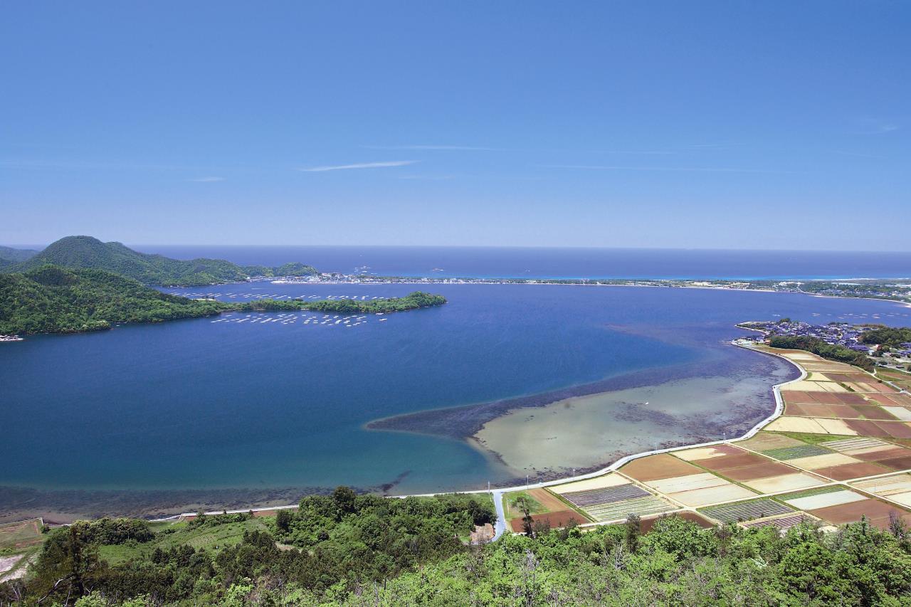 【説明文】 小天橋砂州の形成により日本海と隔てられた内湾。冬に荒れる日本海において、比較的に穏やかな湾内では、カキの養殖が盛んで、カキ棚の並ぶ風景は京都府の文化的景観に選ばれている。