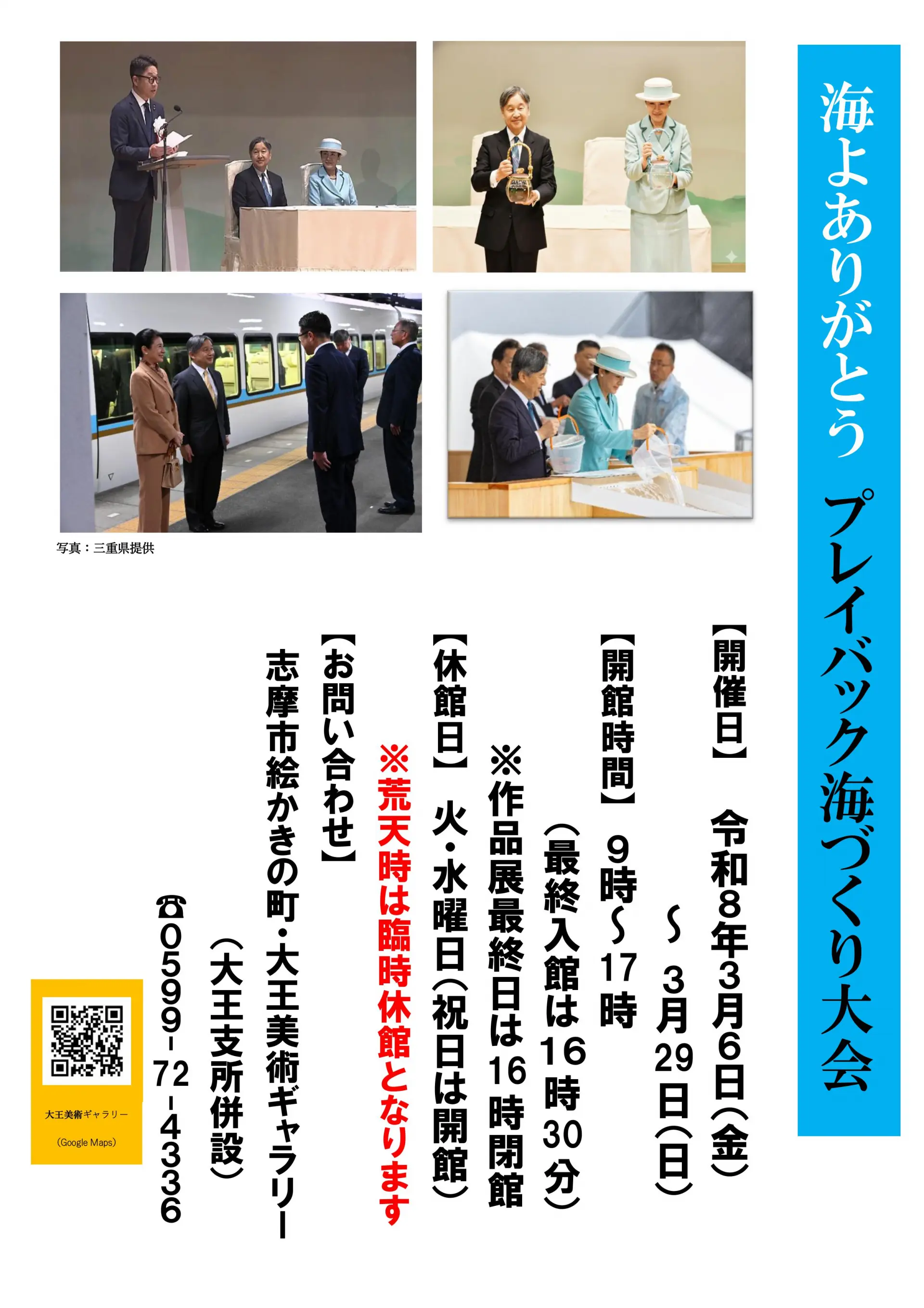 令和7年11月に志摩市・南伊勢町で開催された「第44回全国豊かな海づくり大会~美し国みえ大会~」を記念して、大会の感動と興奮を振り返る回顧展を開催します。