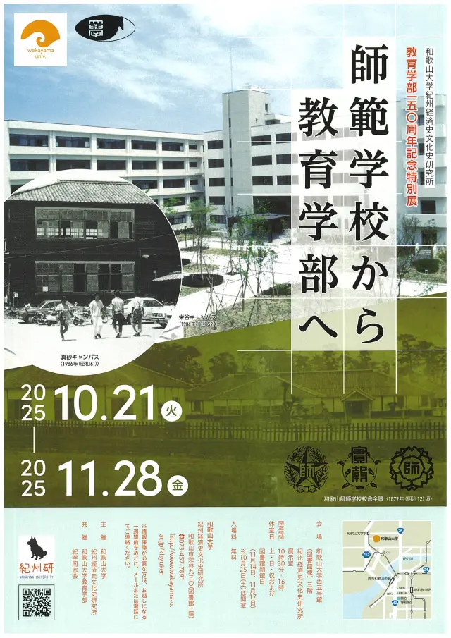 本年は、和歌山県師範学校が誕生してから150年の節目にあたります。この節目にあたり、これまでのあゆみを振り返る特別展を開催いたします。本学には、日本近代史、教育史に関する資料が多数保存・保管されています。歴史的価値の高い貴重な資料であり、この節目を契機として、日ごろ目に触れることの少ない文書・記録・写真・教材などを中心に展示いたします。くすんだセピア色とほこり、そしてそこに込められた思い出とともに、同窓生をはじめ、多くの方々に懐かしさや時代を感じていただければ幸いです。
